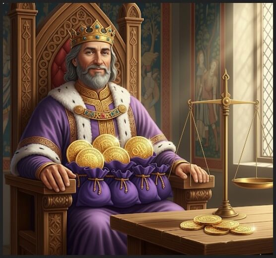 He showed his subjects five royal purple velvet bags and then displayed the five gold coins that each bag contained.