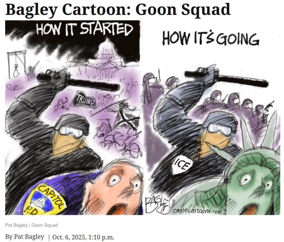 Yesterday, Robert Reich announced the issue of a coffee mug with one of his drawings on it. It’s pricier than I would want (but with Robert Reich, you know whatever he makes from it will be spent on saving democracy), and I’m pretty sure it only comes in one size, but it is Robert Reich, and I wanted to give everyone here a chance to know about it. Last Sunday might, Heather Cox Richardson‘s daily letter summed up No Kings Day from both sides (and there’s no comparison), and I wanted to share that. Sorry I’m late with it, but I think it’s timeless. Also yesterday, the “border czar” (and if we don’t want kings, we really don’t want czars!) announced that he plans to deport 600,000 more people this year. That’s in addition to the 2 million already deported so far. It’s difficult to find a way to express that meaningfully, and I know my math isn’t 100% accurate, but I think it does at least provide an order of magnitude. He’s talking about 0ne out of every thousand people who are still here. So if you know 50 people, you have a 5% chance of someone you know being deported between now and January. Also yesterday – you can call this a typo or you can call it a Freudian slip – The Root made a reference to “Fox News hose Jesse Watters.” (I’m for the Freudian slip.)